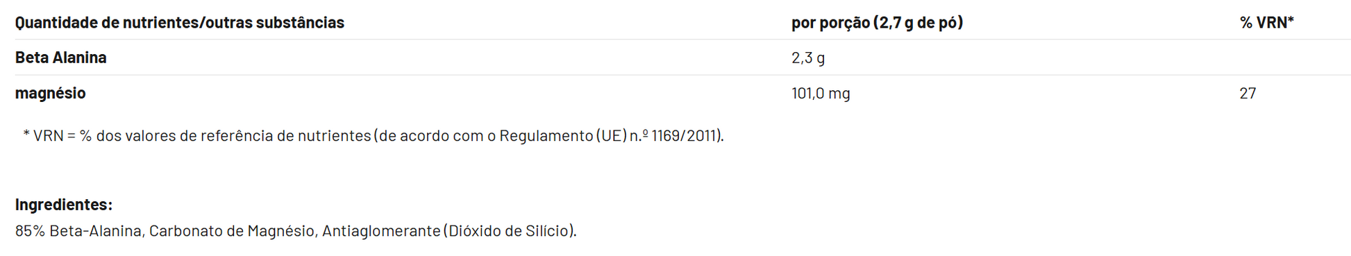 - uma porção contém 2,3 g de beta alanina de alta qualidade