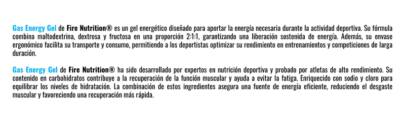 Gas Energy Gel é um gel profissional que combina carboidratos: maltodextrina, dextrose e frutose na proporção de 2:1:1 para fornecer energia durante o exercício.