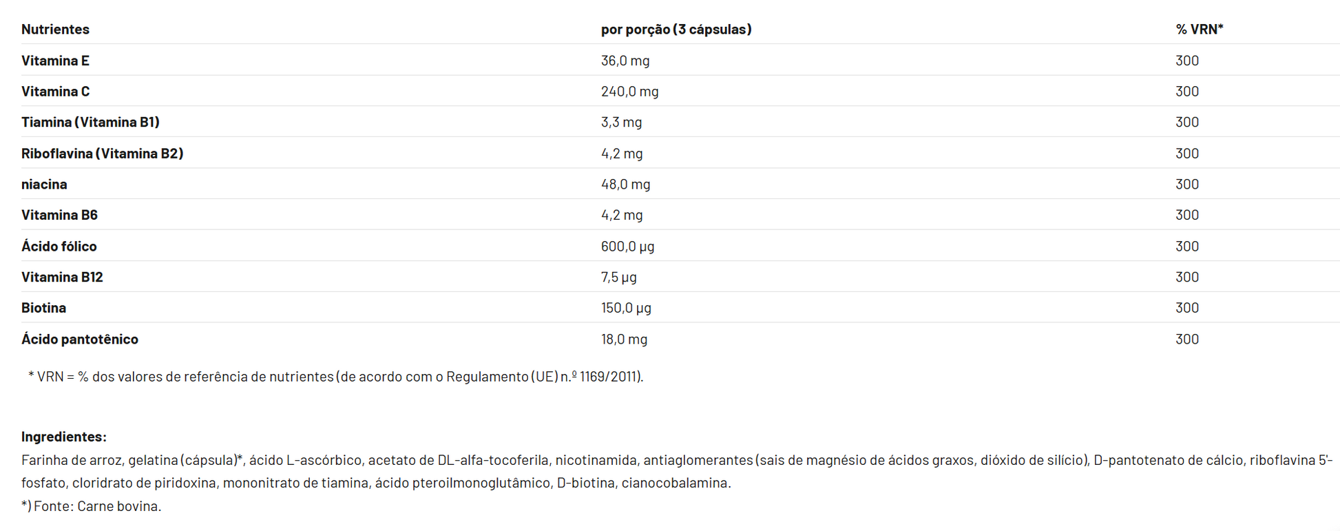- Com vitaminas B1, B2, B6, B12, C, E, niacina, ácido fólico e biotina.