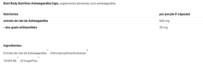As cápsulas de ashwagandha da Best Body Nutrition são fabricadas sob rigorosos padrões de qualidade e contêm uma concentração ideal de ingredientes ativos. A Best Body Nutrition utiliza a matéria-prima patenteada e certificada orgânicaKSM-66®,que possui múltiplas certificações internacionais e cuja pureza, qualidade e segurança são monitoradas continuamente.O KSM-66® é derivado exclusivamente da raiz da planta ashwagandha e, portanto, é particularmente rico em compostos vegetais secundários, os withanolides. Ele fornece o espectro completo de withanolides da raiz em suas proporções naturais.