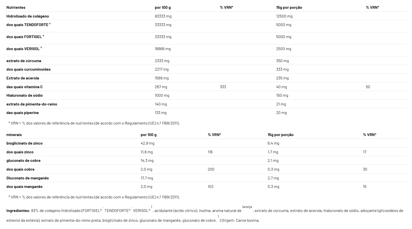 O Hidrolisado de Colágeno de Laranjacombina três complexos de peptídeos de colágeno cientificamente pesquisados.FORTIGEL® fornece peptídeosde colágenoespecíficos que contribuem para a sustentação da estrutura da cartilagem.TENDOFORTE®foi desenvolvido para promover a elasticidade e a força dos tendões e ligamentos.VERISOL® fortalece a pelededentro para fora e contribui para a melhora da elasticidade. Comvitamina C, que contribui para a formação normal de colágeno para o funcionamento normal da pele, cartilagem e ossos, além dezinco, cobre, manganês, ácido hialurônicoeextratos vegetaisde cúrcuma e pimenta-do-reino.Sabor frutado de laranja, adoçado naturalmente comglicosídeos de esteviol– ideal para uso diário.