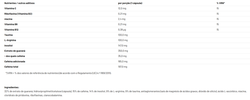 O extratode guaranáé derivado dos frutos vermelhos de uma planta liana sul-americana rica em cafeína. Eles contêm de 4 a 8% de cafeína. Uma característica fundamental é que a cafeína do guaraná está ligada a taninos. A cafeína é o principal ingrediente ativo do café, por exemplo. Ela também é encontrada em mais de 60 plantas, como o cafeeiro, o chá e a noz de cola. As cápsulas Professional Kick Speed Evolution contêm os aminoácidos taurina e L-arginina.A taurinapertence à classe dos aminoácidos sulfônicos. O corpo humano consegue produzir taurina por si só. Também a obtém através da alimentação. Carnes, peixes e laticínios são particularmente ricos em taurina.A L-argininaé um aminoácido semiessencial. O corpo consegue produzir uma pequena quantidade dela. Alimentos como ovos de galinha, salmão, carne de porco e peito de frango contêm L-arginina. Asvitaminas adicionais B2, B6, B12, vitamina C e niacina presentes nas cápsulas Professional Kick Speed Evolutionproporcionam umimpulso extra. Vitaminas são nutrientes essenciais que o corpo não consegue produzir sozinho. Isso significa que devem ser obtidas através da alimentação ou de suplementos. Por exemplo, as vitaminas B2, B6 e B12, assim como a niacina, contribuem para aredução do cansaçoe da fadiga. Além disso, as vitaminas B6, B12 e a vitamina C contribuem positivamente para o metabolismo energético normal e para o funcionamento normal do sistema imunológico.
