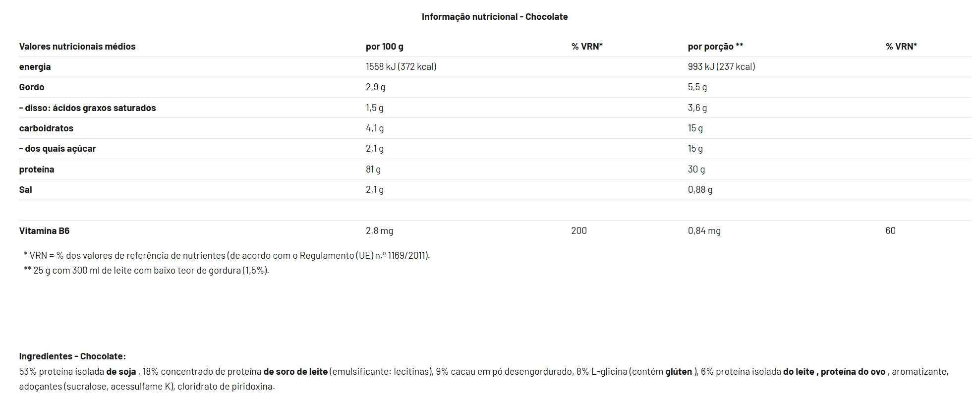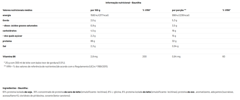 A Proteína Fórmula 90 da Mammut é uma mistura de quatro componentes proteicos, feita com soja, leite, soro de leite e clara de ovo, ideal para preparar um shake proteico. A proteína desempenha um papel vital no desenvolvimento do corpo e deve ser consumida em quantidades suficientes, isso aplica-se a todos, não apenas a atletas. A proteína contribui para o crescimento e a manutenção da massa muscular e para a saúde óssea. A Proteína Fórmula 90 da Mammut também é enriquecida com vitamina B6, que contribui para o metabolismo energético normal e para o funcionamento normal do sistema imunológico. A vitamina B6 também contribui para o metabolismo normal de proteínas e glicogênio.
