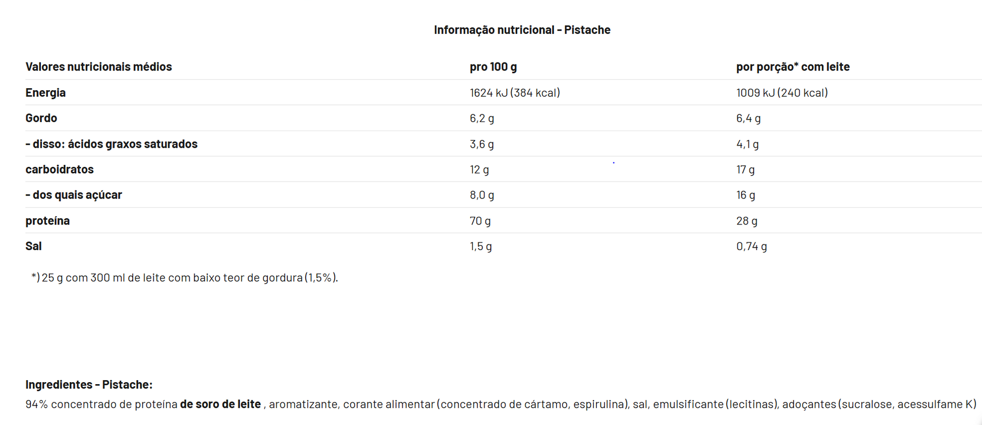 Mammut Whey Protein, concentrado proteico para preparação de bebidas frias aromatizadas. Com adoçantes. Sabor pistácio.
