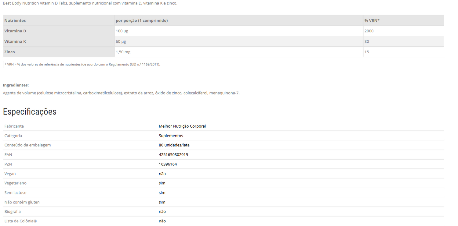 - comprimidos de alta qualidade com vitamina D3, vitamina K2 e zinco